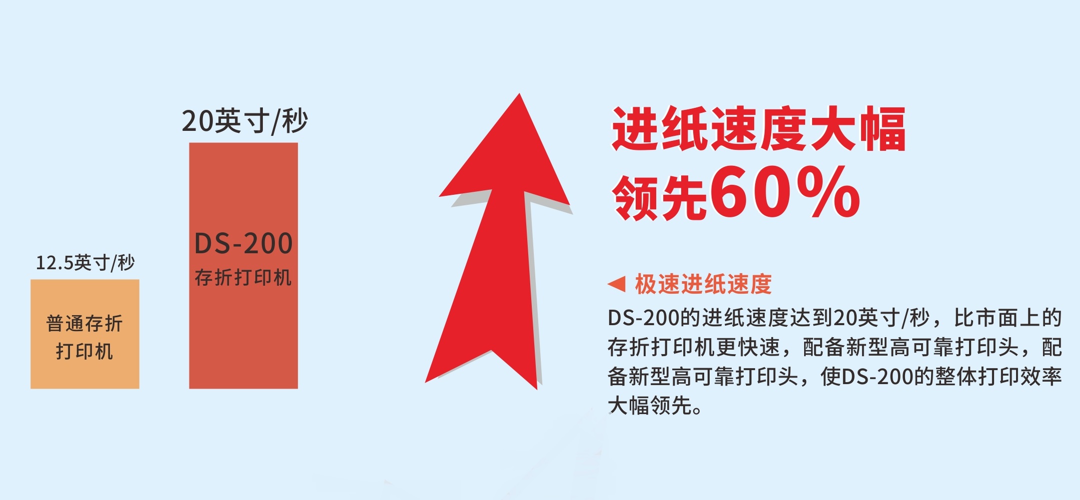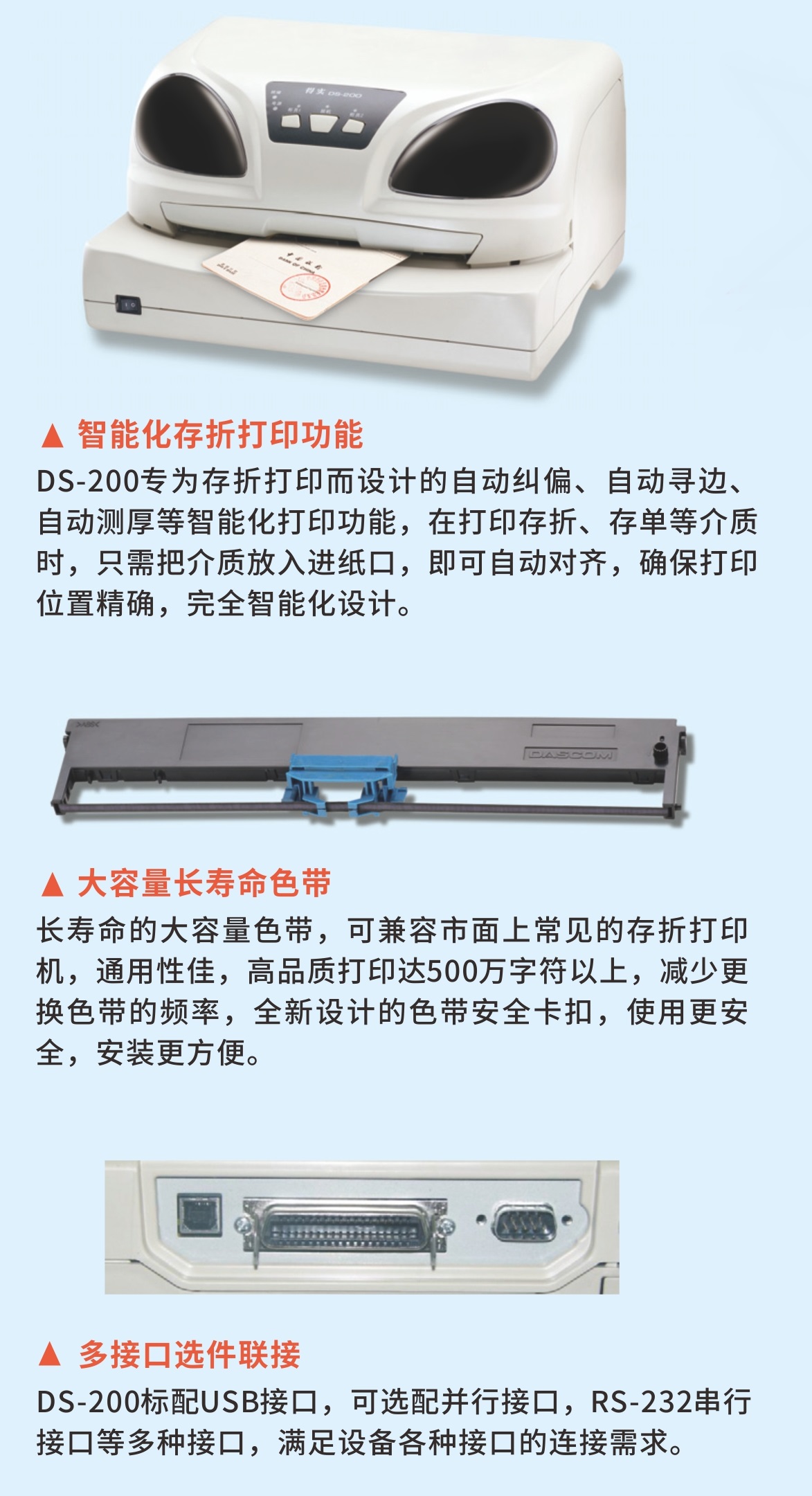 DS-200是得实新推出的一款专业智能存折打印机。DS-200打印头寿命高达5亿次/针,超高速打印达252汉字/秒,1+6联高穿透拷贝能力,并具备自动纠偏、自动对边、智能化测厚技术。DS-200内置浮动式打印平台,可自动适应打印介质厚度,完全满足银行各类存折、证簿、票据打印需求。