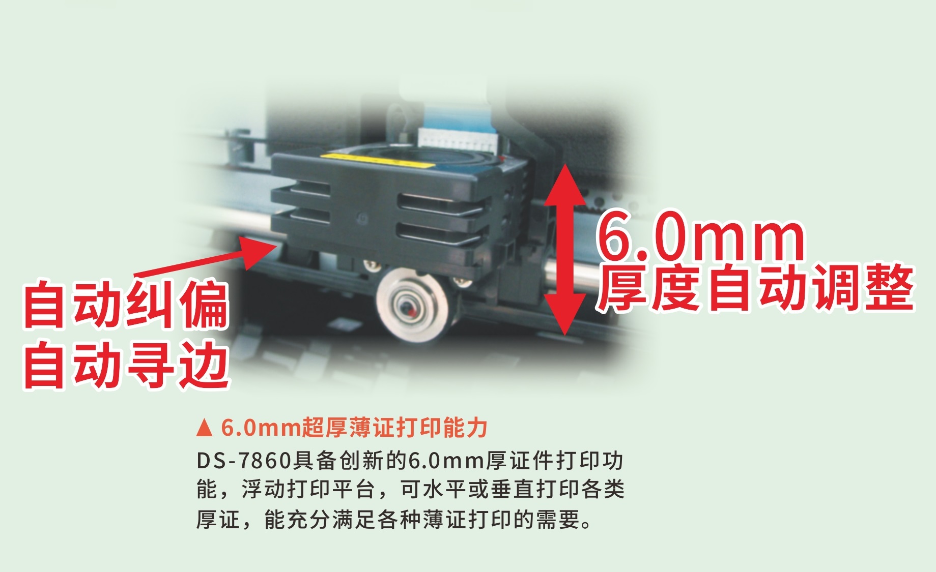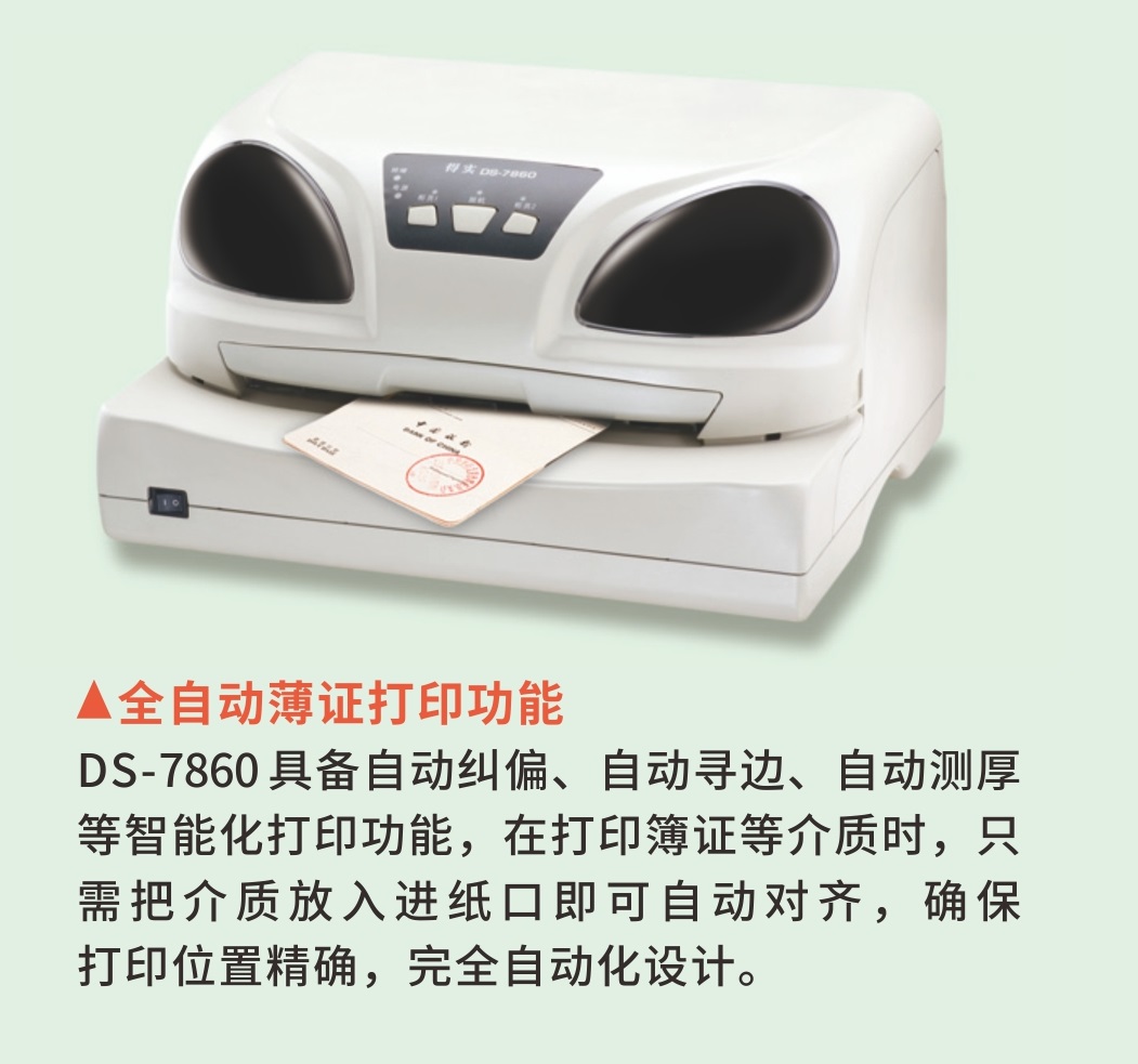 DS-7860是得实新推出的一款24针超厚簿证打印机。特高速打印达504字/秒,打印头寿命达5亿次/针,配备存折打印机具备的自动纠偏、自动寻边、自动测厚等智能化打印功能。配备浮动式打印平台,杰出的纸张处理能力确保各种超厚证簿打印领域得心应手。