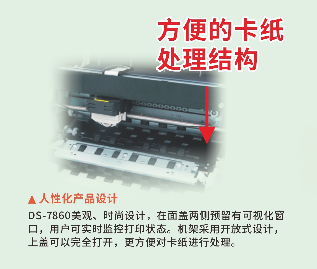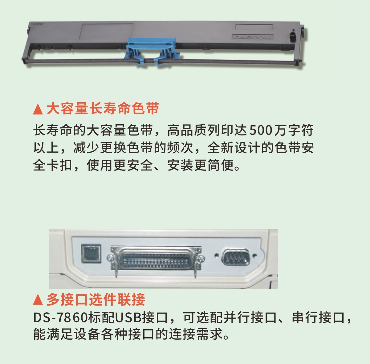 DS-7860外观时尚精美、平均无故障时间长达30000小时,1000万字符大容量色带寿命,配置GB-18030中文大字库。