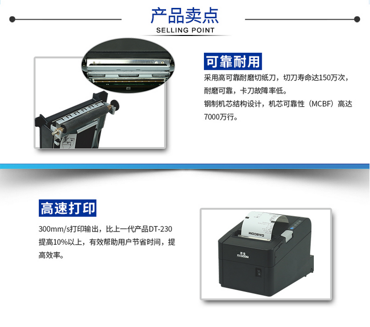 打印头寿命150公里;自动切纸刀寿命200万次;MTBF高达360000小时,足以承受高负荷环境下的稳定运行。