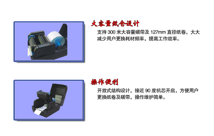 开放式结构设计,接近90°机芯开启,方便用户更换纸卷及碳带,操作维护简单。