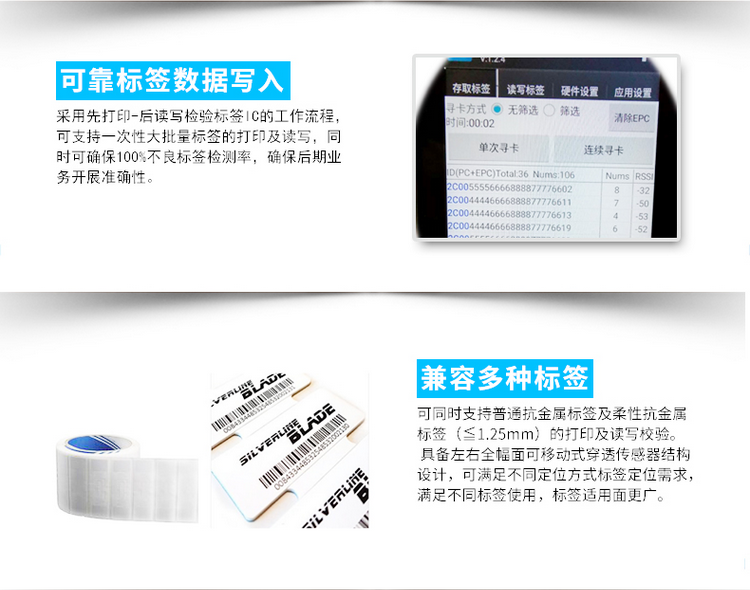 支持普通不干胶RFID及1.25mm以下柔性抗金属标签 *特殊标签视乎具体芯片而定