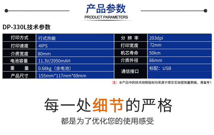 得实DP-330L是一款工业级便携式热敏标签打印机,采用双色一次性硅树脂注塑工艺,整机皮实耐用,抗摔能力强,即使从1.2米高度跌落到水泥地面上,打印机也能正常功能。打印速度达4英寸/秒,工作效率大大提升,3芯11.3V 2950mA锂电池设计,智能省电设计,续航能力强,广泛适用于物流仓储、交警、邮政、烟草、超市、服装等领域。