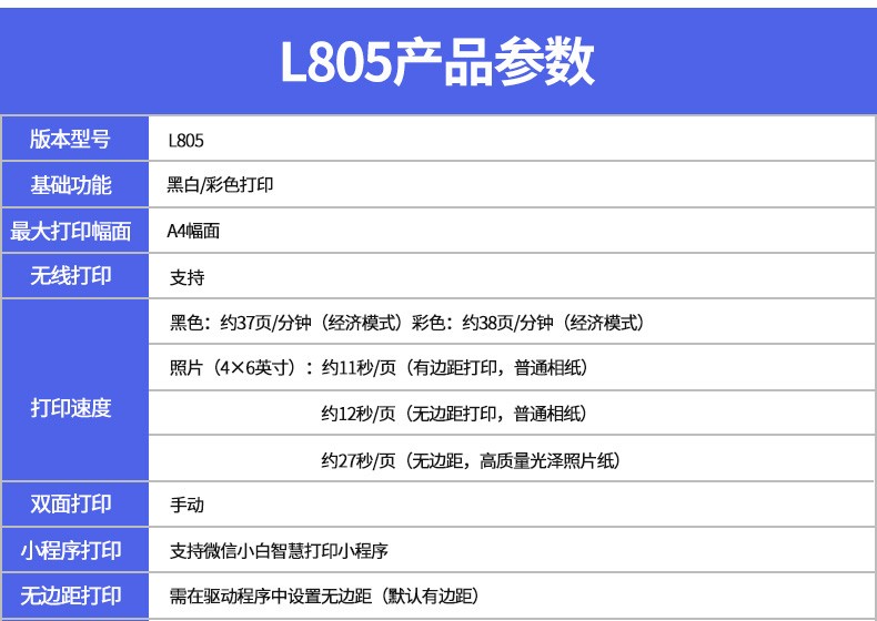 照片(4x6英寸):照片(Draft,10x15cm/4x6in)约11s每张 (W/Border) 约12s每张(Borderless) (打印在高质量光泽照片纸上) 照片(Draft,10x15cm/4x6in)约27s每张(Borderless)