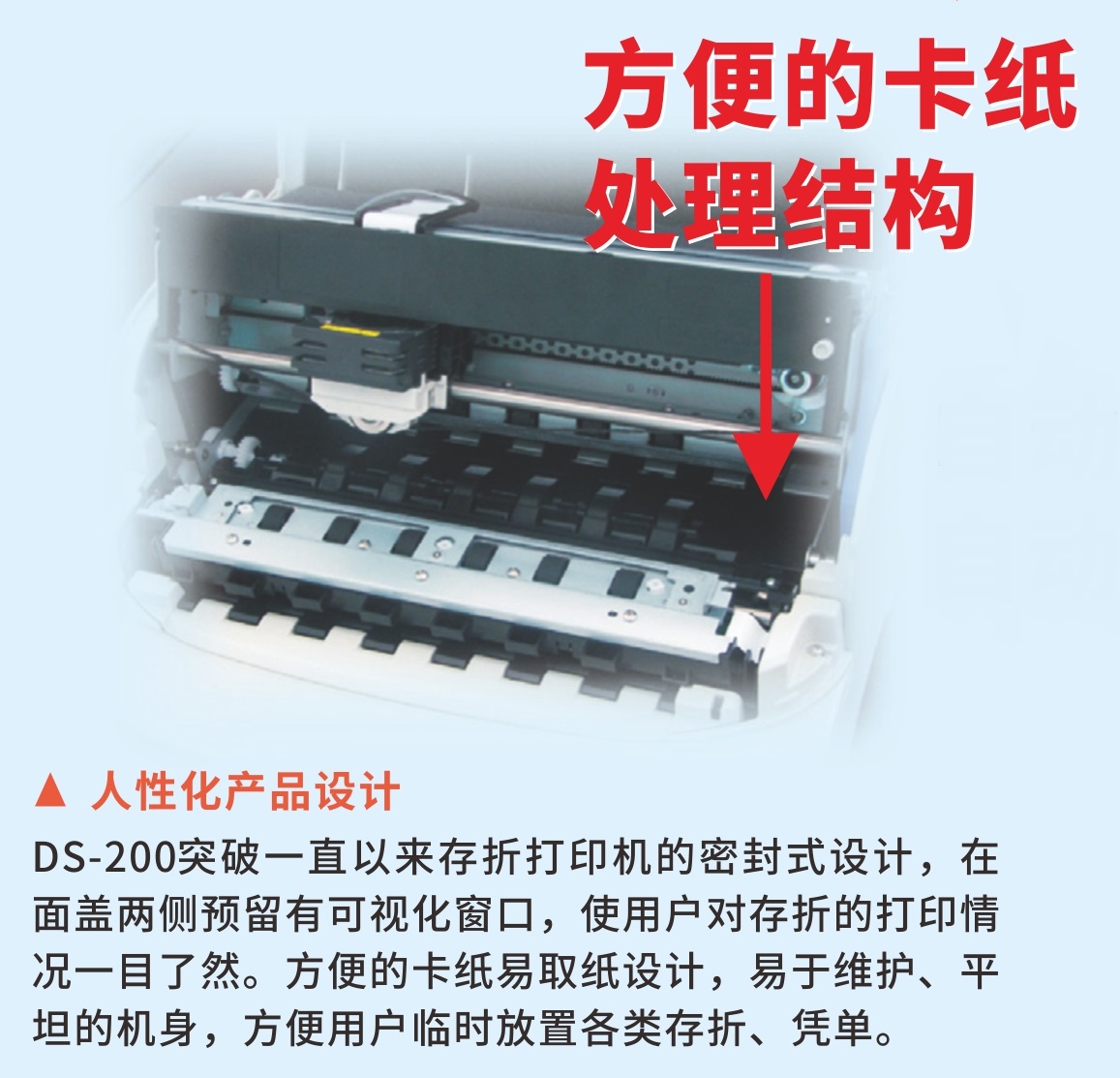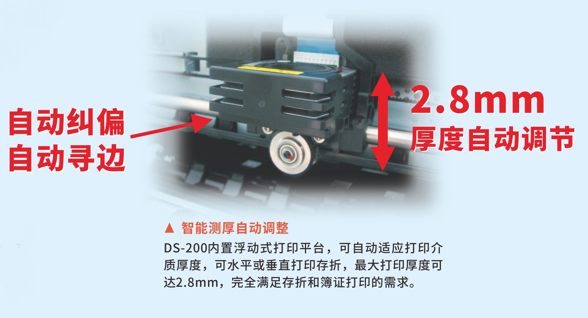 DS-200是得实新推出的一款专业智能存折打印机。DS-200打印头寿命高达5亿次/针,超高速打印达252汉字/秒,1+6联高穿透拷贝能力,并具备自动纠偏、自动对边、智能化测厚技术。DS-200内置浮动式打印平台,可自动适应打印介质厚度,完全满足银行各类存折、证簿、票据打印需求。