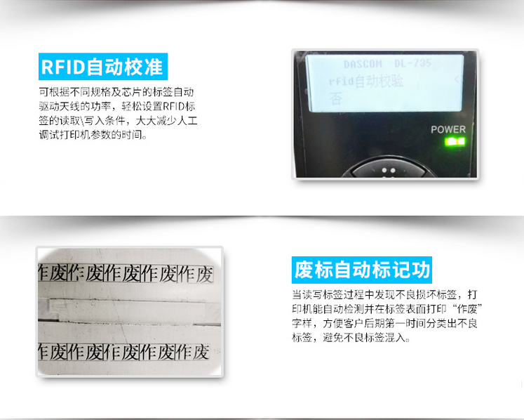 废标自动标记功能,当读写标签过程中发现不良损坏标签,打印机能自动检测并在标签表面打印“作废”字样,方便客户后期第一时间分类出不良标签,避免不良标签混入。