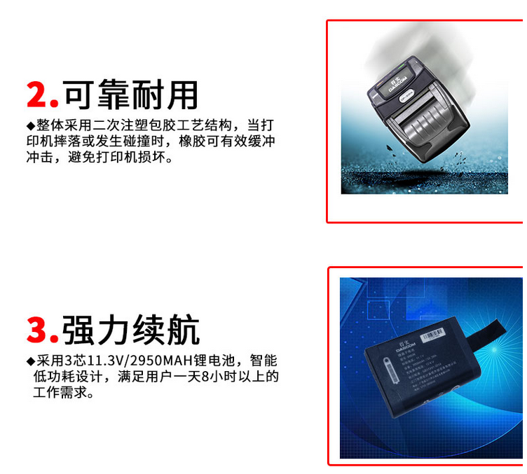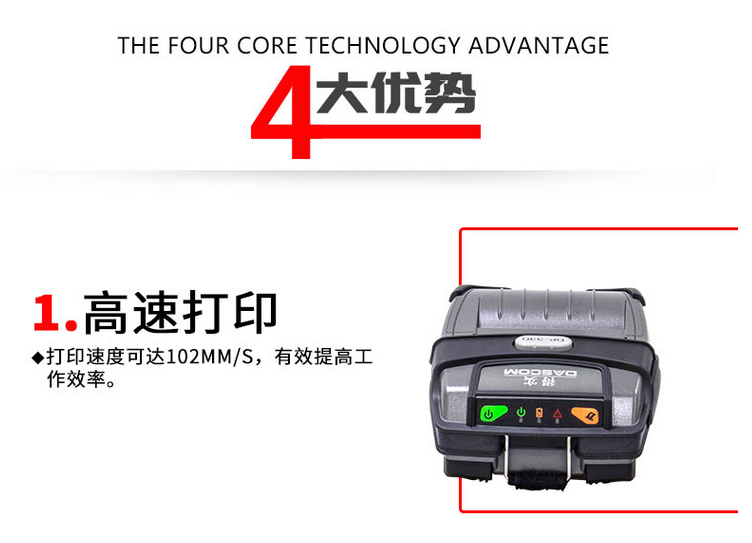 得实DP-330L是一款工业级便携式热敏标签打印机,采用双色一次性硅树脂注塑工艺,整机皮实耐用,抗摔能力强,即使从1.2米高度跌落到水泥地面上,打印机也能正常功能。打印速度达4英寸/秒,工作效率大大提升,3芯11.3V 2950mA锂电池设计,智能省电设计,续航能力强,广泛适用于物流仓储、交警、邮政、烟草、超市、服装等领域。